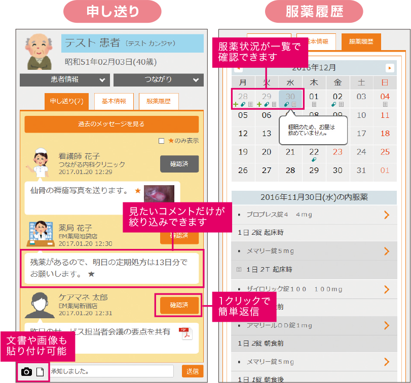 これまではお薬の情報は紙でしか確認できず、いつ何を飲んだらいいのかがわかりにくかったのですが、ひろがるケアネットでは、そのとき飲む薬がわかるのはもちろんですが、飲んだ状況も先生に伝えられるので、かなり便利になりました。