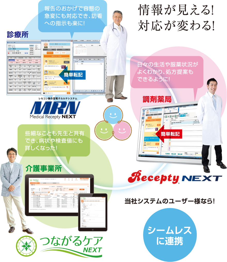 超高齢化社会の進展により、今後ますます高齢者ケアの需要の高まりが予想される日本。地域における医療・介護サービス事業者間のICTを活用した効率の良い連携が不可欠となります。医療介護連携ソリューション「ひろがるケアネット」は診療所向け、調剤薬局向け、介護サービス事業者向けのシステムとシームレスな連携機能により、医療と介護の円滑な連携を実現します。
